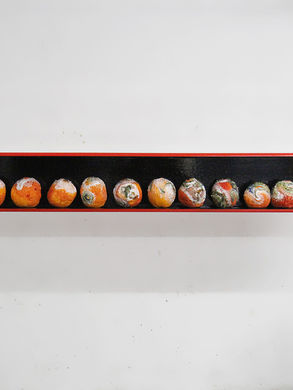 Boîte 130 x 14 x 14 cm, laquée noire et rouge, composé de 14 oranges brodés dans le sens chronologique de décomposition de gauche à droite.